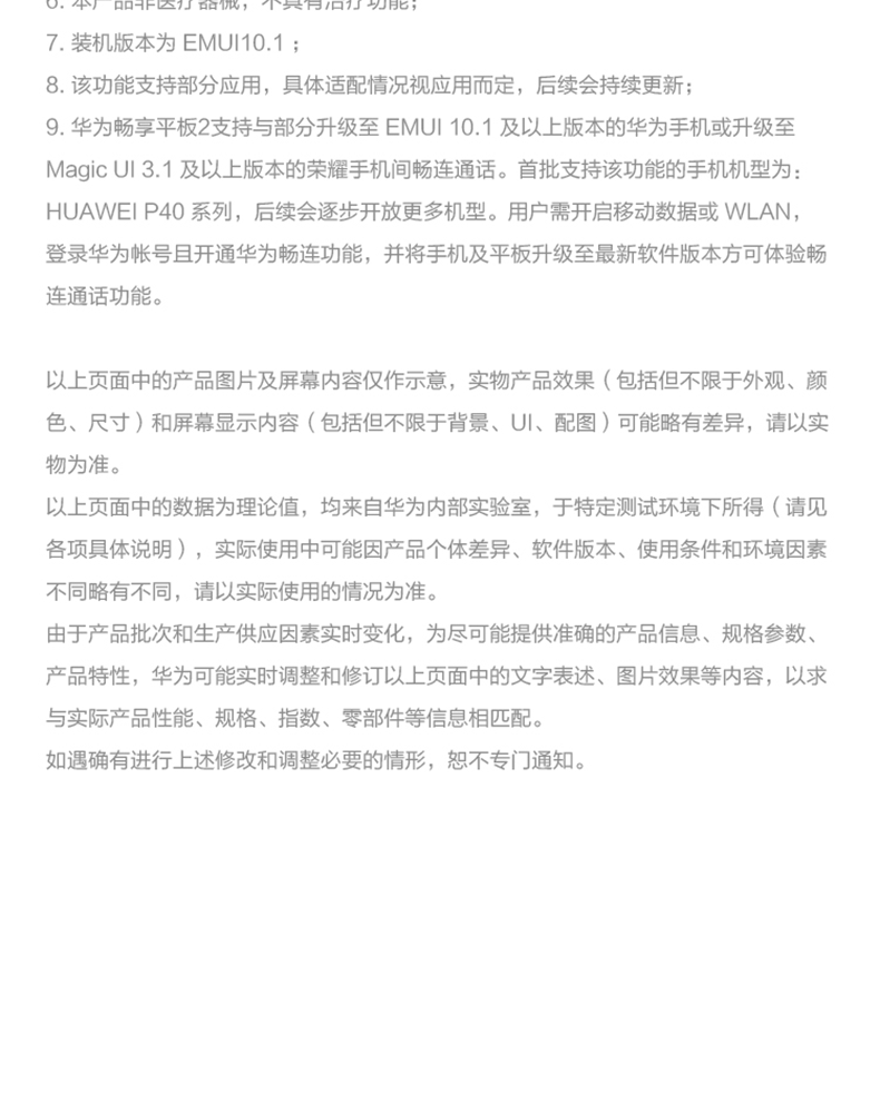 規(guī)格參數(shù) 其他屬性 售后服務(wù) 全國聯(lián)保 電信設(shè)備進網(wǎng)許可證編號 17-5043-201324 處理器品牌 海思 存儲 存儲類型 EMMC 內(nèi)存容量 4GB 存儲容量 4GB+64GB 4GB+128GB 顯示 分辨率 1920x1200 觸摸屏類型 IPS 十點觸控電容屏 像素 200萬 屏幕尺寸 10.1英寸 后置攝像頭像素 500萬 基本參數(shù) 品牌 Huawei/華為 型號 暢享平板2 接口類型 Nano-SIM 卡接口(僅全網(wǎng)通版本支持),3.5mm耳機接口,USB Type-C接口 核心數(shù) 八核心 顏色分類 香檳金 深海藍 CPU主頻 4×Cortex A73 2.0GHz + 4×Cortex A53 1.7GHz 廠商 華為 處理器構(gòu)架 Cortex-A73 Based 處理器型號信息 Kirin710A(海思麒麟710A) 熱門功能 全高清屏幕,大振幅揚聲器,哈曼卡頓調(diào)音,教育中心,平行視界,暢連通話 操作系統(tǒng) EMUI 10.1(基于Android 10) 網(wǎng)絡(luò) 網(wǎng)絡(luò)類型 全網(wǎng)通 WIFI