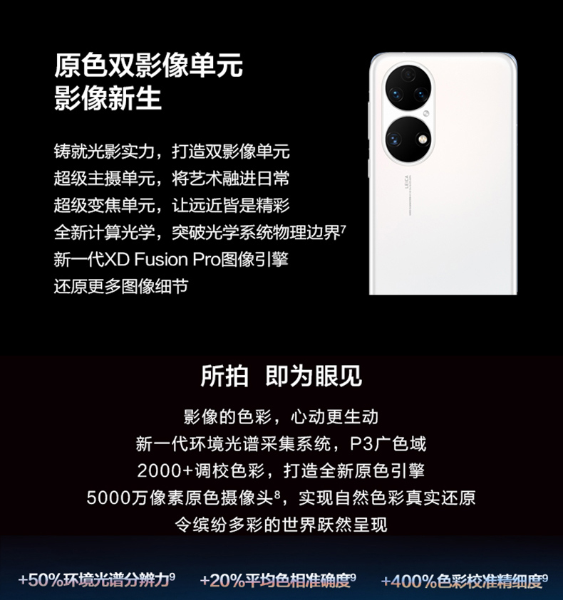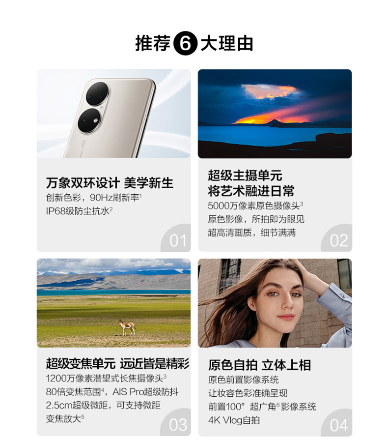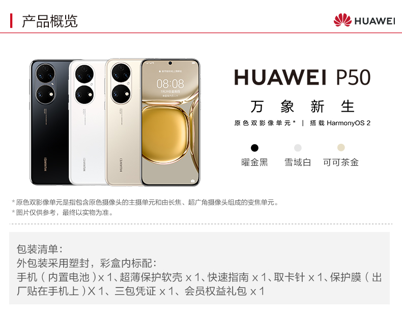 規(guī)格參數(shù) 拍照功能 后置攝像頭 5000萬像素原色攝像頭+ 1300萬像素超廣角攝像頭+ 1200萬像素長焦攝像頭 攝像頭類型 四攝像頭(前一后三) 顯示 分辨率 FHD+ 2700 x 1224 像素 屏幕尺寸 6.5英寸 網(wǎng)絡(luò) 網(wǎng)絡(luò)類型 4G 全網(wǎng)通 網(wǎng)絡(luò)模式 雙卡雙待 機身詳情 款式 直板 存儲 存儲容量 8+128GB 8+256GB 基本參數(shù) 品牌 Huawei/華為 華為型號 P50 CPU核心數(shù) 八核 機身顏色 曜金黑 雪域白 可可茶金 手機類型 智能手機 操作系統(tǒng) HarmonyOS CPU品牌 高通