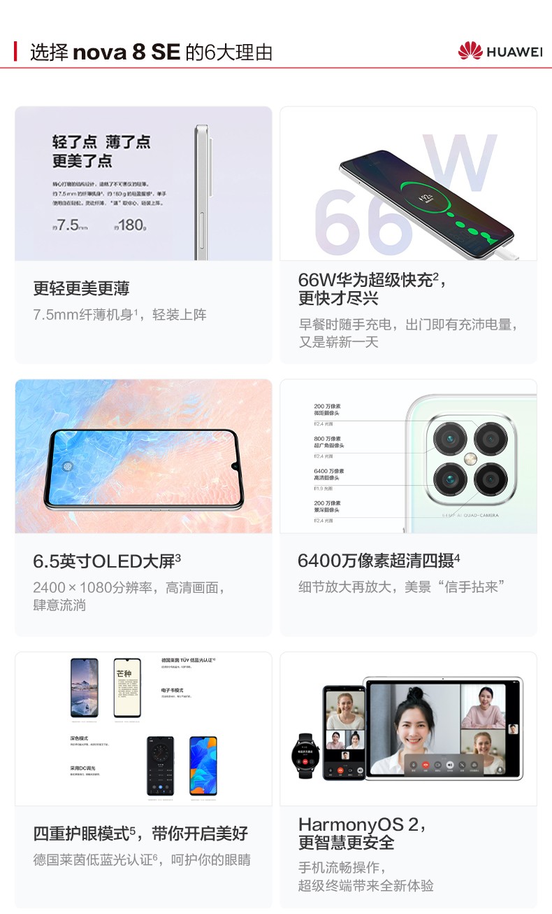 規(guī)格參數(shù) 拍照功能 后置攝像頭 6400萬(wàn)像素?cái)z像頭 + 800萬(wàn)像素FF廣角攝像頭 + 200萬(wàn)像素微距攝像頭 + 200萬(wàn)像素虛化 攝像頭類(lèi)型 前單+后四 顯示 分辨率 2400×1080 像素 屏幕尺寸 6.5英寸 網(wǎng)絡(luò) 網(wǎng)絡(luò)類(lèi)型 4G 全網(wǎng)通 網(wǎng)絡(luò)模式 雙卡雙待 機(jī)身詳情 款式 直板 存儲(chǔ) 存儲(chǔ)容量 8+128GB 基本參數(shù) 品牌 Huawei/華為 華為型號(hào) NOVA8 SE 機(jī)身顏色 櫻雪晴空 銀月星輝 深海藍(lán) 幻夜黑 手機(jī)類(lèi)型 拍照手機(jī) 智能手機(jī) 4G手機(jī) 操作系統(tǒng) HarmonyOS CPU品牌 海思