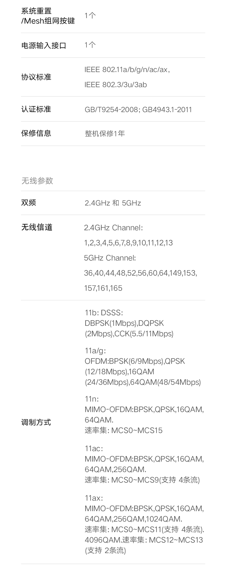 規(guī)格參數(shù) 其他屬性 售后服務(wù) 全國(guó)聯(lián)保 網(wǎng)絡(luò)標(biāo)準(zhǔn) 802.11b 802.11g 802.11a 802.11n 802.3u 802.3 802.11ac wifi6 有線傳輸率 千兆端口 無(wú)線傳輸速率 6000Mbps 無(wú)線網(wǎng)絡(luò)支持頻率 2.4G&5G 適用對(duì)象 大戶型 專(zhuān)業(yè)游戲路由 基本參數(shù) 顏色分類(lèi) 小米路由器AX6000 配置參數(shù) 是否無(wú)線 是 無(wú)線傳輸速度 5400M 是否內(nèi)置防火墻 是 是否支持WDS 是 是否支持WPS 是 是否可拆 不可拆